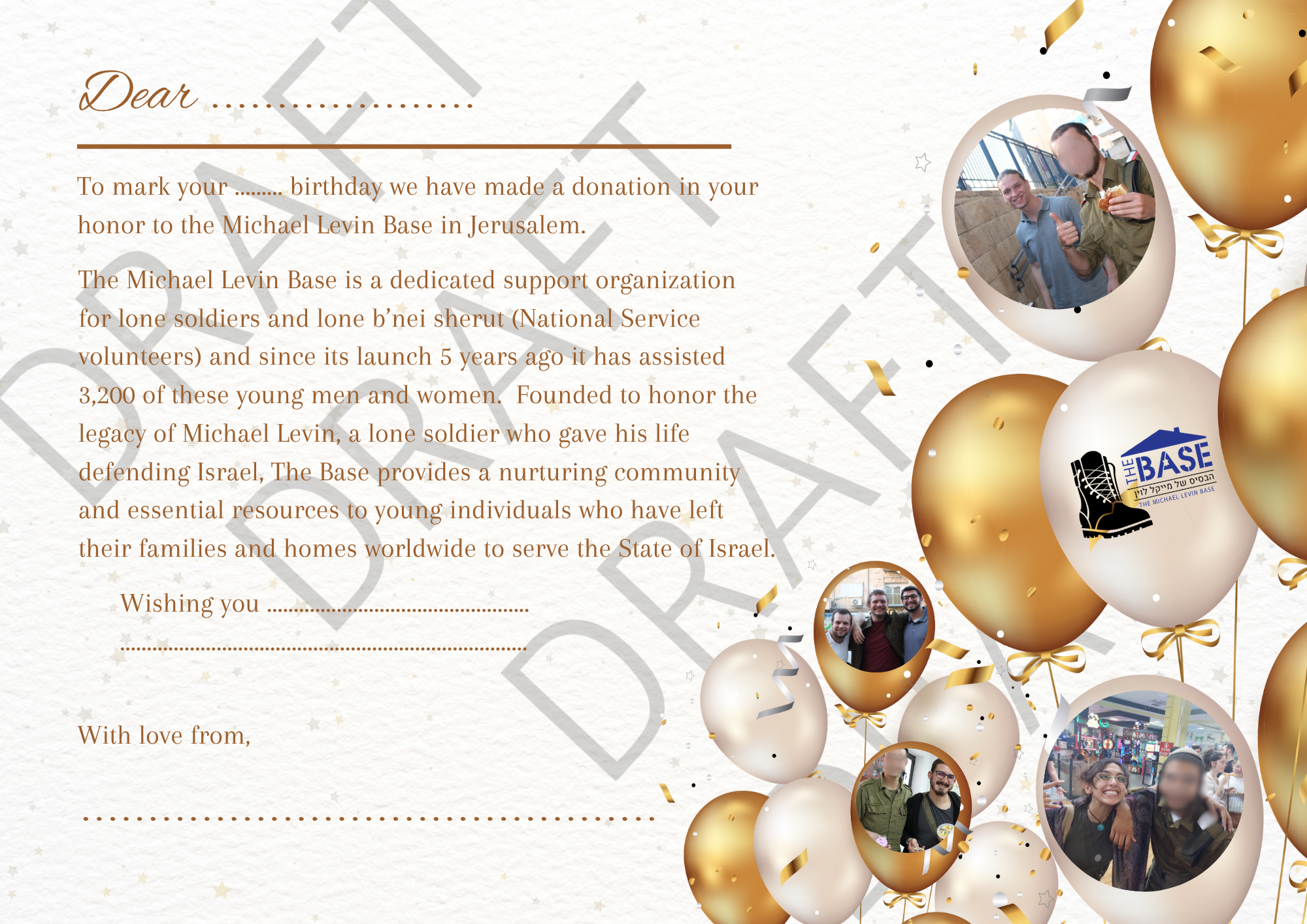 Our suggested minimum donation is 120 NIS or $36 per recipient.